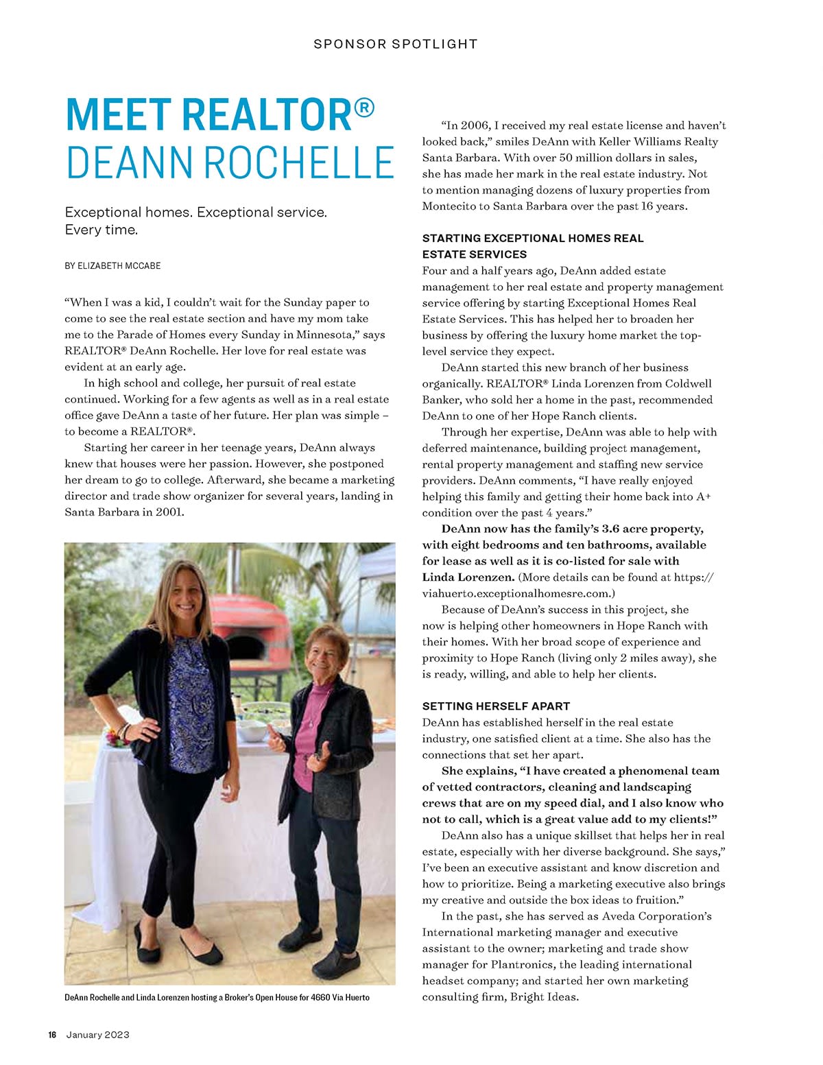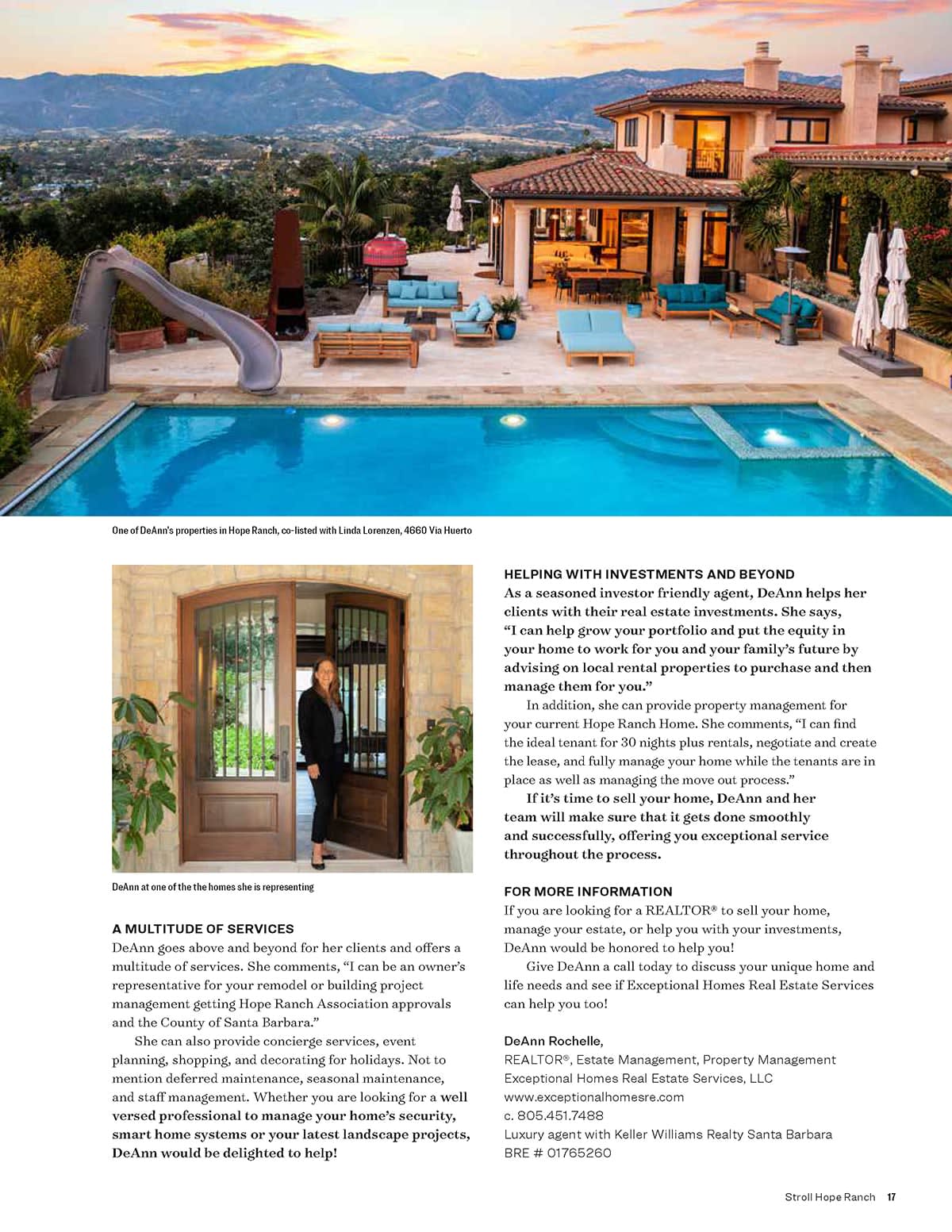 Our agent DeAnn Rochelle has recently been featured in the popular Stroll Magazine. We are honored and excited to be chosen as part of this edition, which celebrates her hard work and dedication to providing the best in real estate and property/estate management in Hope Ranch. So please join us as we take you through our feature article from Stroll Magazine!